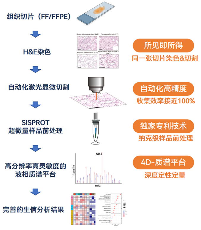 贝普奥生物H&E空间蛋白质组学通过将空间维度的激光显微切割技术和贝普奥生物独家专利的SISPROT样品前处理技术整合,在同一张切片上进行染色分析、自动化切割、精准收集和高深度质谱检测。其中基于高度集成化的SISPROT前处理技术可以几乎无损的进行显微切割的微量组织样品的前处理,2小时内完成高灵敏度的蛋白质样品前处理,并兼顾了前处理过程中的稳定性、重复性,结合高分辨率高灵敏度的液相质谱平台,为最终获得高质量的深度蛋白质组数据奠定扎实的技术流程。