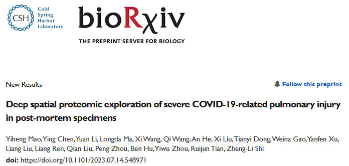2023年7月,中国科学院武汉病毒研究所石正丽教授课题组联合南方科技大学田瑞军教授课题组和华中科技大学同济医学院周亦武教授课题组,在bioRxiv上发表的题为“Deep spatial proteomic exploration of severe COVID-19-related pulmonary injury in post-mortem specimens”的研究,通过H&E染色结合空间蛋白质组对武汉大流行第一批死亡患者留存的FFPE样品进行了高深度空间蛋白质组学检测。其中,在71个样品中共检测到超过1万种蛋白质,绘制了新冠肺损伤高深度蛋白质图谱,发现了由新冠引发的通路失调,从而揭示了肺损伤机制。该研究为后续治疗方案的开发提供了新的方向。