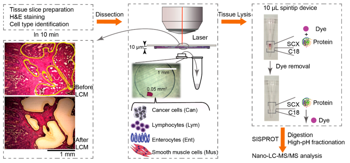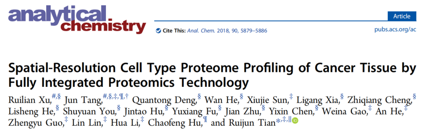 2018年4月,南方科技大学田瑞军教授课题组在Analytical Chemistry上发表了题为“Spatial-Resolution Cell Type Proteome Profiling of Cancer Tissue by Fully Integrated Proteomics Technology”的研究,通过H&E染色、激光显微切割和SISPROT样品前处理技术,首次对结肠癌癌细胞、肠细胞、淋巴细胞和平滑肌细胞进行了空间维度的蛋白质组学检测,成功地实现了肠细胞、淋巴细胞和平滑肌细胞在相同组织切片和连续切片上的空间蛋白质组分布图。