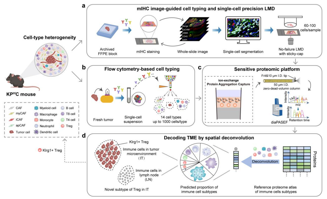 南方科技大学田瑞军教授课题组在bioRxiv上发表的题为“Multimodal single cell-resolved spatial proteomics reveals pancreatic tumor heterogeneity”的文章,通过将空间可视化蛋白质组和细胞类型蛋白质组相结合,对胰腺癌的肿瘤微环境进行深度解析。在同一张切片上进行了3标4色的多重免疫荧光染色和质谱检测,获得了厘米级大视野高质量成像和高深度蛋白质组结果,同时通过流式细胞术分离了14种细胞类型,每种细胞类型分选1000个细胞,共鉴定了超过7000种蛋白质。通过反卷积算法准确预测了肿瘤和淋巴结构中9种免疫细胞亚型的比例,发现了一种新的免疫抑制T细胞亚型,随后精准预测并验证了其在胰腺癌肿瘤细胞区域而非淋巴结构区域的空间特异性。