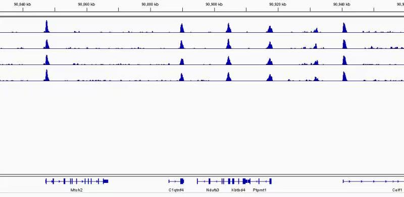 在稳定抽核的基础上我们开展了表观遗传学服务,宸谱生物技术人员具有13年的ChIP-seq经验,我们的优势体现在基于独特实验流程的“转录因子ChIP-seq”,具有高信噪比的特点。下图是我们做的一个demo数据。