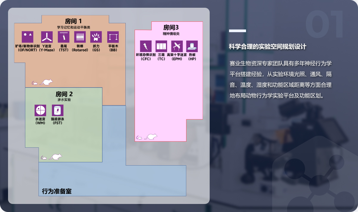 大小鼠是神经行为学研究中常用的动物模型,赛业生物资深专家团队经过多年筹备,搭建大小鼠神经行为学平台,拥有专业行为学实验设备及记录分析系统,可提供水迷宫、新物体识别、Y迷宫、转棒、旷场、强迫游泳、高架十字迷宫等多类型大小鼠行为学实验服务。您可以选择使用赛业生物的行为学平台设施自行实验,也可以委托赛业生物进行从模型定制、手术/药物处理,到行为学实验及病理标志物检测的一站式服务,更短时间内帮您完成课题任务。现订购大小鼠行为学服务,立享7折优惠!欢迎拨打400-680-8038或邮件至info@cyagen.com联系我们。
