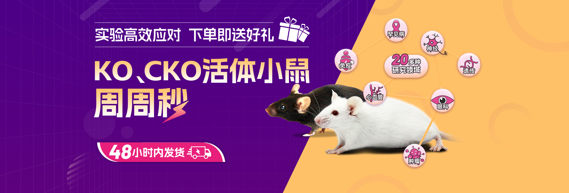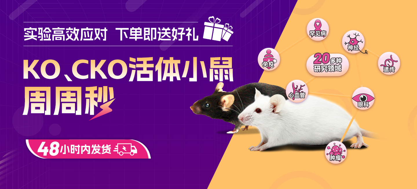 前方高品质小鼠模型来袭:赛业生物为你精选多个品系的活体基因敲除小鼠、条件性敲除小鼠,每逢周一上新,其应用方向涵盖免疫、肿瘤、罕见病、心血管、神经、眼科等多个热门研究领域。即刻参与KO、CKO小鼠秒杀活动,快至48小时发货,还能获赠百元星礼卡或视频VIP半年卡。让我们一期一会,相约成为更高效的科研人!欢迎拨打400-680-8038或邮件至info@cyagen.com联系我们。