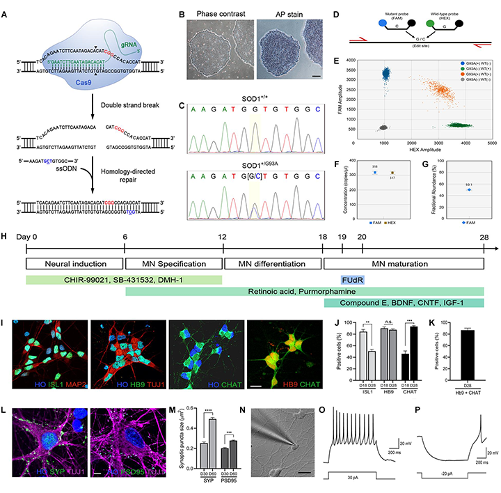 肌萎缩侧索硬化(ALS)是一种致命的神经退行性疾病,其特点是运动皮层、脑干和脊髓中的运动神经元(MNs)逐渐退化和消失。一些家族性ALS是由超氧化物歧化酶1(SOD1)基因突变引起的。研究人员使用CRISPR/Cas9基因组编辑系统和人类诱导多能干细胞(iPSCs),制备了高度纯化的iPSC分化的MNs SOD1-G93A点突变模型。通过与野生型细胞系和患者iPSC(含SOD1-A4V突变)分化的MNs作比较,确定了与ALS相关的病理表型。