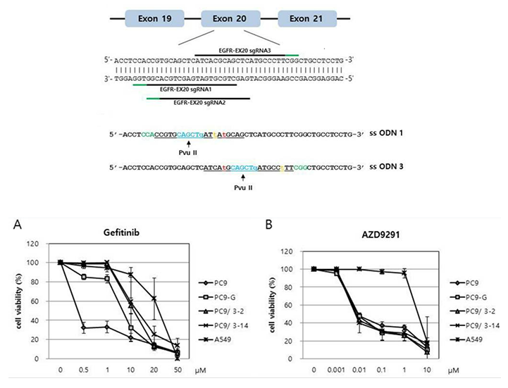 酪氨酸激酶抑制剂(TKIs)如吉非替尼(gefitinib)和厄洛替尼(erlotinib)对肺腺癌表皮生长因子受体(EGFR)突变有效。但癌细胞会在长时间接触这些药物后产生耐药性,超过50%的病例是由EGFR T790M突变引起。使用新药还会产生额外的耐药突变。研究人员通过CRISPR/Cas9技术构建了PC9 T790M突变增强型细胞株,在PC9原有基础上提高了T790M突变比例,并且在等量吉非替尼暴露下,PC9 T790M突变细胞株耐药性更强,但对奥西替尼敏感性更强。因此利用CRISPR/Cas9构建的点突变细胞株效率更高,更适用于三代EGFR小分子抑制剂筛选。