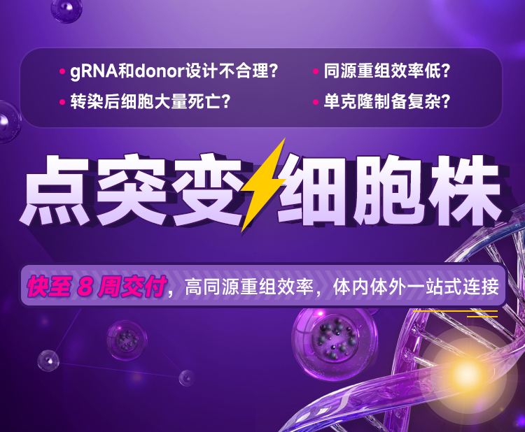 要使某个表型在细胞内稳定表达,可以通过点突变实现,即将外源突变位点通过同源末端重组的方式与基因组中特定位点进行替换。但在实际研发过程中,结果总是不尽人意。在构建细胞株时,你是否难以得到点突变纯合子?培养出来的细胞状态差?相比于基因敲除细胞株,点突变细胞株在设计实验方案时,需要考虑基因片段长短、同源重组效率等多种因素,不同细胞株编辑效率差异很大,构建难度偏高。