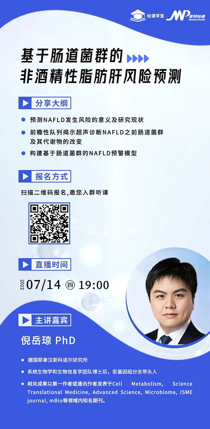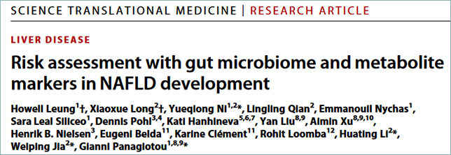 2022年6月9日,德国耶拿汉斯科诺尔研究所(Hans Knoll Institute)——倪岳琼博士及上海交通大学研究团队在Science Translational Medicine杂志上在线发表题为“Risk assessment with gut microbiome and metabolite markers in NAFLD development”的研究论文。该研究确定了在未来数年内存在NAFLD风险的受试者的微生物组特征,构建了NAFLD的风险预测模型,并指出了其成为NAFLD非侵入性诊断测试的潜力,以补充现有的临床筛查工具,借助广泛的国际合作证明了模型的良好泛化能力,推动国际学界携手应对代谢性疾病挑战。