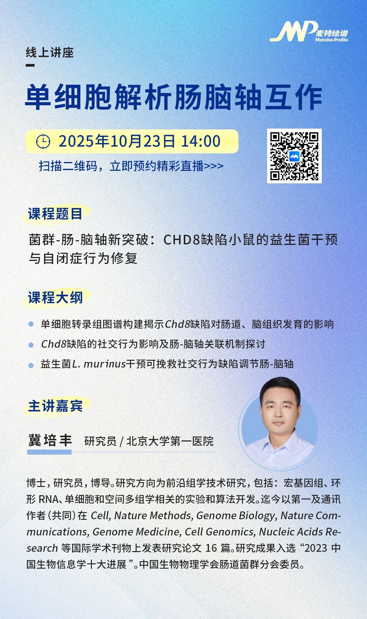 2025年10月23日14:00,麦特绘谱特邀本篇研究第一作者来自北京大学第一医院的冀培丰研究员做客绘谱学堂,带来关于《单细胞解析肠脑轴互作:CHD8缺陷小鼠的益生菌干预与自闭症行为修复》的主题报告,为各位科研同仁分享在菌群-肠-脑轴方面的研究工作。欢迎大家相约直播间,会后特设答疑环节,线上一起探讨研究热点、交流科研观点。