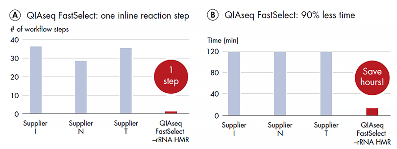 QIAGEN 经典 “黑科技” QIAseq FastSelect 系列试剂盒,仅需一步移液操作将试剂加入到样本中,随后经过14 min 的梯度降温反应,即可将总RNA中的rRNA 和(或)Globin mRNA“封闭”住,使其不能进行反转录、二链合成等反应,最终无法进入构建好的NGS文库,无需任何额外纯化步骤。与需要30多步耗费2h并需要进行磁珠纯化的传统去除方法相比,显著提高测序工作的效率,同时由于没有纯化步骤,降低了核酸的损失,针对低起始量样本或低拷贝转录本的检出效果也更好。