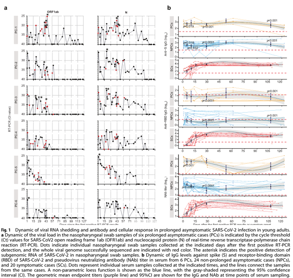 研究人员连续收集了一组新冠感染者鼻咽拭子,其中6名感染者表现出典型的持续感染特征,新冠病毒核酸检测持续阳性时间中位数为106天,最长达120天。另外有24名感染者病程较短,作为非持续感染对照组,其持续阳性时间中位数为7天。