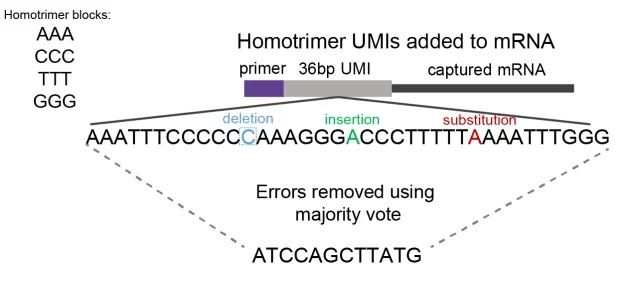 图1:显示同源三聚体UMI majority vote错误纠正的示意图。我们用同源三聚体核苷酸块(由AAA、CCC、GGG、TTT组成的组合)构建了UMIs。通过评估三聚体核苷酸的相似性,通过“majority vote”系统识别和纠正删除、插入或替代的错误,选择最常见的核苷酸。