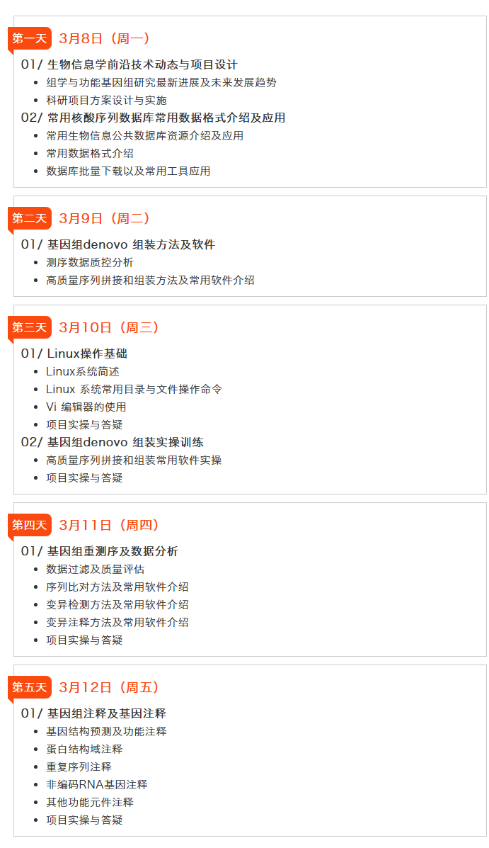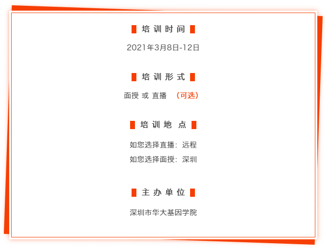 2021年3月-华大基因-基因组学前沿技术专题培训班课程安排如下: