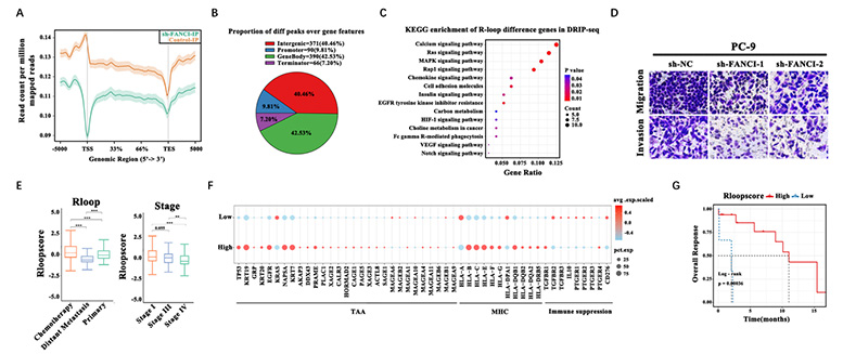 为探索R-loop与肺腺癌(LUAD)进展的关系,作者采用 R-loop测序技术,并敲低R-loop关键调节因子FANCI,发现FANCI敲低明显影响R-loop在基因区域(图1A)以及各种基因元件上的分布(图1B),而且R-loop差异富集基因在癌症发展相关信号通路上有显著富集(图1C),敲低FANCI对Ras信号通路的活性也有显著削弱,导致下游的PI3K/AKT/NF-κB和MAPK/ERK通路被进一步抑制,最终抑制肿瘤细胞的增殖、迁移能力,促进肿瘤细胞凋亡(图1D)。此外,文章还利用单细胞测序与R-loop调节因子的表达数据构建了R-loop评分模型,发现R-loop评分在不同状态和分期病人中具有显著差异(图1E)、与恶性肿瘤细胞的免疫逃逸基因表达显著相关(图1F),且LAUD患者的生存率与R-loop评分也显著关联(图1G)。这些结果共同说明,R-loop可作为LUAD预后预测和临床治疗的潜力因子。