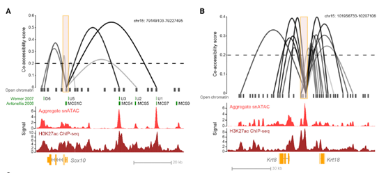 研究正常乳腺发育过程中单细胞状态,该研究发现许多增强子与Sox10启动子具有很强的推定共可达性,并在功能上证实它们是Sox10表达的主要驱动因素[1]。
