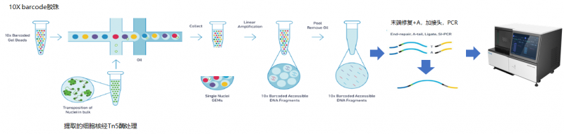 首先将提取好的细胞核,经Tn5进行孵化处理;然后将细胞核上样,与凝胶微珠以及反映体系混合,流经油相泳道后,形成GEM结构油包水微滴,进而细胞核膜破裂后,捕获到的DNA片段进行扩增后破乳,获得带有barcode的DNA片段。最后完成测序接头连接,进行DNBSEQTM测序。