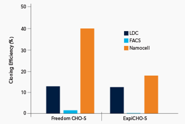 单细胞柔性分选系统对CHO细胞进行克隆生长排序,并与限量稀释法(LDC)和荧光激活细胞分选仪(FACS)进行了比较。结果显示使用单细胞柔性分选系统比LDC和FACS具有更高的克隆效率。