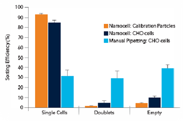 通过对单细胞柔性分选系统与有限稀释法的铺板效率进行对比,结果发现,与手动稀释(约30%)相比,单细胞柔性分选系统在分配单细胞方面非常高效且一致性强(对哺乳动物细胞的效率为80-90%)。
