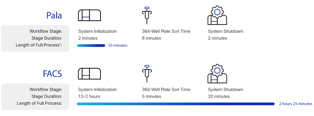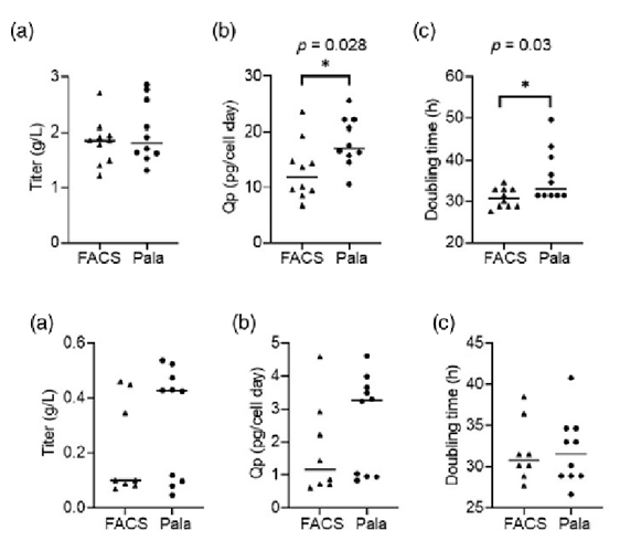 阿斯利康对比了传统FACS与单细胞柔性分选系统Pala, 结果表明与FACS衍生细胞系相比,Pala具有相当甚至更优的细胞生长和生产能力,且操作简单,运行/维护成本低,可以作为替代FACS更具性价比,高效便捷的选择。