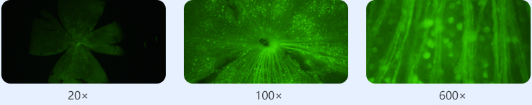 高质量活体实时影像,包括明场、血管结构以及GFP,YFP,CFP,mCherry标记的荧光成像,聚焦范围可从晶状体到视网膜表面。