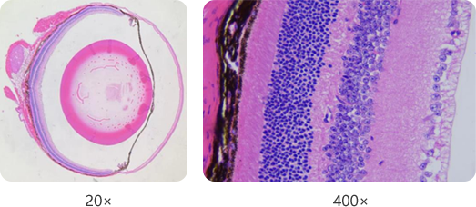 ● 图左:小鼠眼球HE染色(石蜡切片);图右:视网膜HE染色(石蜡切片)