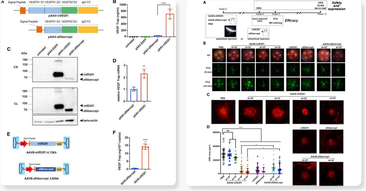 新生血管性AMD以脉络膜新生血管(CNV)为特征,并伴有渗出、视网膜内和视网膜下出血、视网膜色素上皮脱离、硬性渗出物或视网膜下纤维瘢痕。研究人员通过,小鼠眼底激光诱导出了小鼠的疾病模型,并根据抑制新生血管的生成的作用机制设计了可以阻断血管内皮生长因子(VEGF)的AAV-antiVEGF的药物,结果证实AAV-antiVEGF对激光诱导的小鼠脉络膜新生血管有抑制作用,能有效的阻止AMD疾病的进展,为黄斑变性患者的治疗提供了潜在的治疗方法。该文章无论从研究思路和策略,再到技术方法,都为我们今后应用小动物疾病诱导模型,开展相关基因功能研究,以及基因治疗方法及其效果评价提供了非常好的参考借鉴作用。