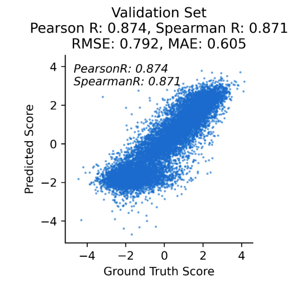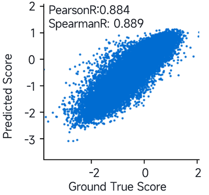 利用赛业生物AI-AAV平台,通过构建高库容突变体质粒文库、包装病毒文库、NGS测序,搭建DualConvLSTM网络构建AAV2产量预测模型,经在测试集上验证模型可信度较高,相关性已达Pearson=0.929,Spearman=0.859(图7);AI构建的视网膜靶向性模型,在测试集上相关性达Pearson=0.874,Spearman=0.871(图8)。
