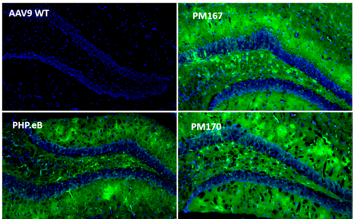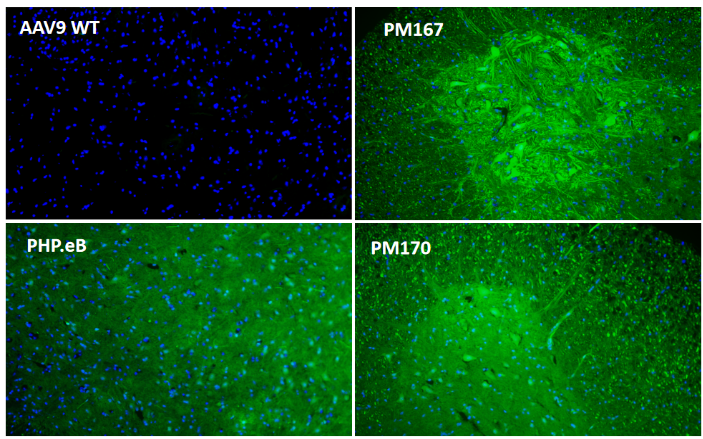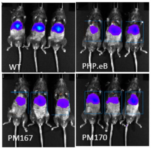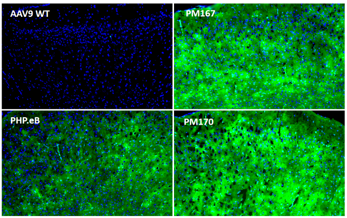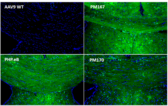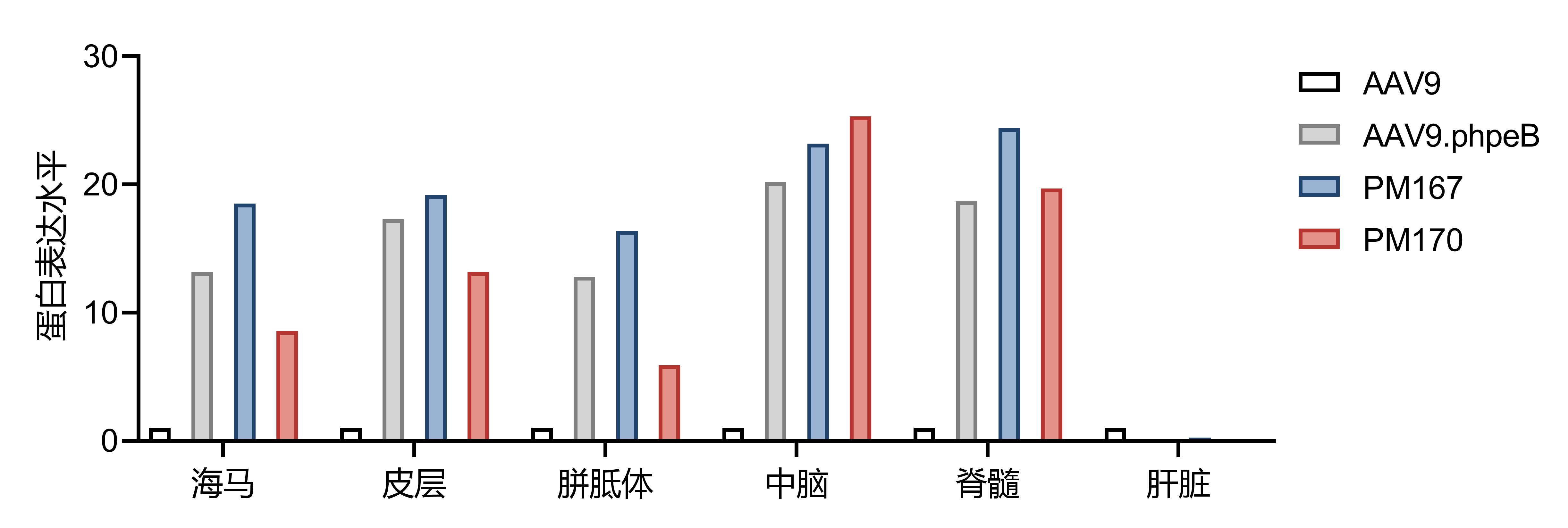 通过AI筛选后的AAV9病毒变体PM167、PM170在C57BL/6J小鼠模型中以较低剂量进行尾静脉注射,数据显示其对各神经相关组织的感染能力强,能高效转导中枢神经系统,同时负靶向肝脏,适用于各类神经疾病的基础和应用研究。