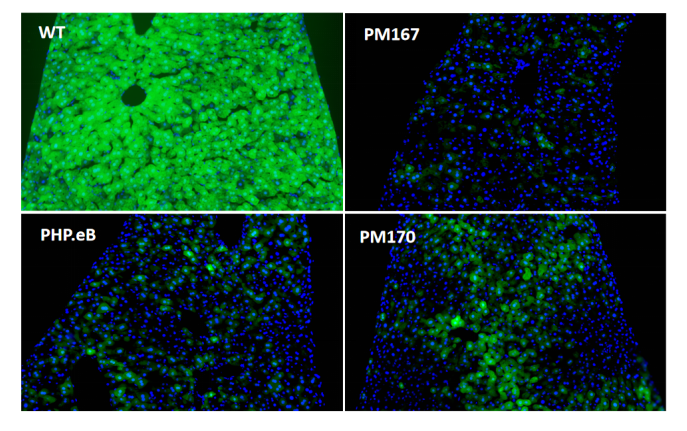 在小鼠体内尾静脉注射(5E11vg/只)后21天检测,冰冻切片结果显示(图6)PM167在肝脏的绿色荧光蛋白信号显著低于PHP.eB,PM170在肝脏的绿色荧光蛋白信号略高于PHP.eB,但仍显著低于AAV9野生型(WT)。