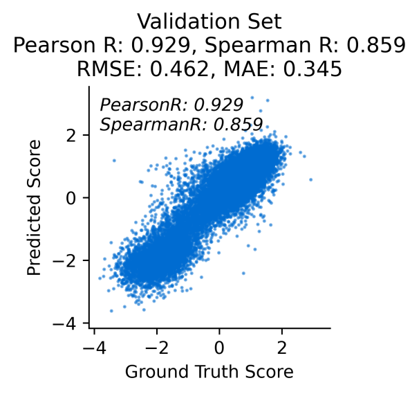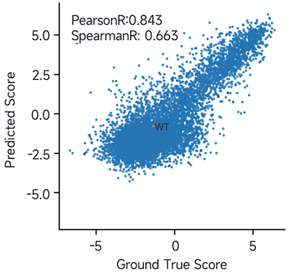 赛业生物搭建的AI平台通过整合大数据、云计算、机器学习等多个技术优化AAV9衣壳蛋白,得到大量的候选变体,结果显示预测的中枢神经系统靶向性数据(图1)可信度高,PearsonR高达0.843。