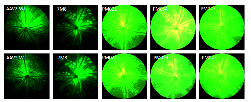 通过AI筛选后的AAV2病毒变体在C57BL/6J小鼠中进行玻璃体腔注射,数据显示病毒变体对眼睛的感染能力强,适用于各类眼底疾病的基础和应用研究。