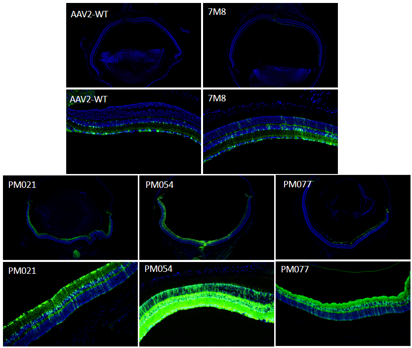 为了进一步验证变体体内感染效果并探究感染的细胞类型,包装EGFP病毒,玻璃体腔注射小鼠(3E+9vg/只眼),3W后通过活荧光眼底拍照检测EGFP整体表达情况,摘取眼球进行病理检测。眼底拍照结果(图12)显示,PM054的GFP信号最强,3种变体荧光信号均显著高于AAV2和AAV2.7M8。