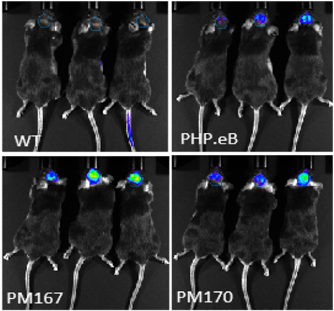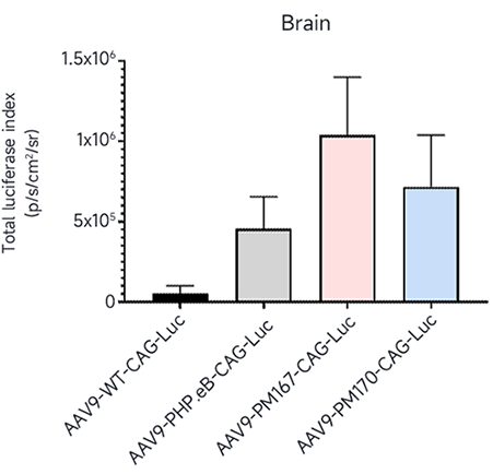 图2. 体内验证大脑感染效率(活体成像, Luc)