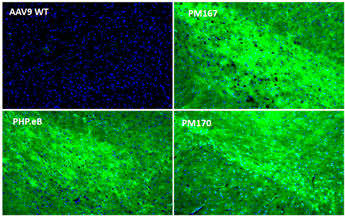 | 创新型AAV9病毒变体1 | PM167 | 18.5 | 19.2 | 16.4 | 23.2 | 24.4 | 0.25 | 1E12vg | 1E12vg | |