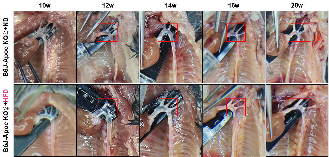 图5. 雌性B6J-Apoe KO小鼠在正常饮食(ND)和高脂饮食(HFD)条件下的主动脉粥样硬化斑块检测。雌性B6J-Apoe KO小鼠在正常饮食12周后可自发形成动脉粥样硬化斑块,其症状较轻。在高脂饲料饲喂诱导后,其主动脉粥样硬化加剧,在喂养第14周后表现越发明显并在第16周时持续加重。
