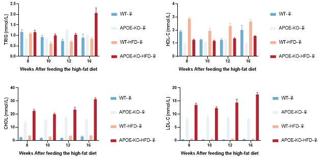 图3. 雌性B6J-Apoe KO小鼠和野生型(WT)小鼠在正常饮食和高脂饮食(HFD)条件下的血脂生化指标。在正常饮食条件下,与野生型小鼠相比,雌性B6J-Apoe KO小鼠的胆固醇(CHOL)和低密度脂蛋白(LDL-C)水平显著升高。高脂饮食会进一步提升雌性B6J-Apoe KO小鼠体内胆固醇(CHOL)和低密度脂蛋白(LDL-C)水平。而雌性B6J-Apoe KO小鼠和野生型(WT)小鼠体内的高密度脂蛋白(HDL-C)和甘油三酯(TRIG)水平没有明显差异。