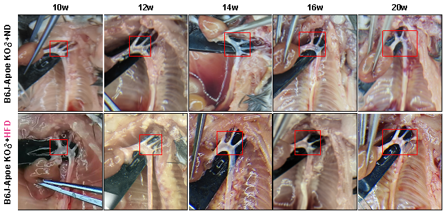 图4. 雄性B6J-Apoe KO小鼠在正常饮食(ND)和高脂饮食(HFD)条件下的主动脉粥样硬化斑块检测。雄性B6J-Apoe KO小鼠在正常饮食10周后可自发形成动脉粥样硬化斑块,症状较轻。在高脂饲料饲喂诱导后,主动脉粥样硬化加剧,在喂养第12周后表现越发明显,第14周症状持续加重并在第16周达中晚期病理表型。