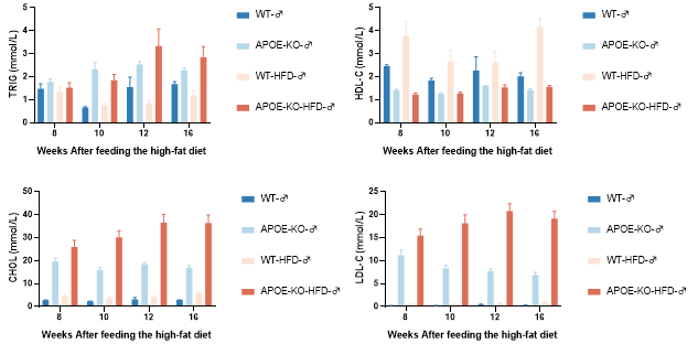 图2. 雄性B6J-Apoe KO小鼠和野生型(WT)小鼠在正常饮食和高脂饮食(HFD)条件下的血脂生化指标。数据显示在正常饮食条件下,与野生型小鼠相比,雄性B6J-Apoe KO小鼠体内甘油三酯(TRIG)、胆固醇(CHOL)和低密度脂蛋白(LDL-C)水平有不同程度升高。高脂饮食进一步提升雄性B6J-Apoe KO小鼠体内以上指标的水平。而雄性B6J-Apoe KO小鼠和野生型(WT)小鼠体内的高密度脂蛋白(HDL-C)水平没有明显差异。