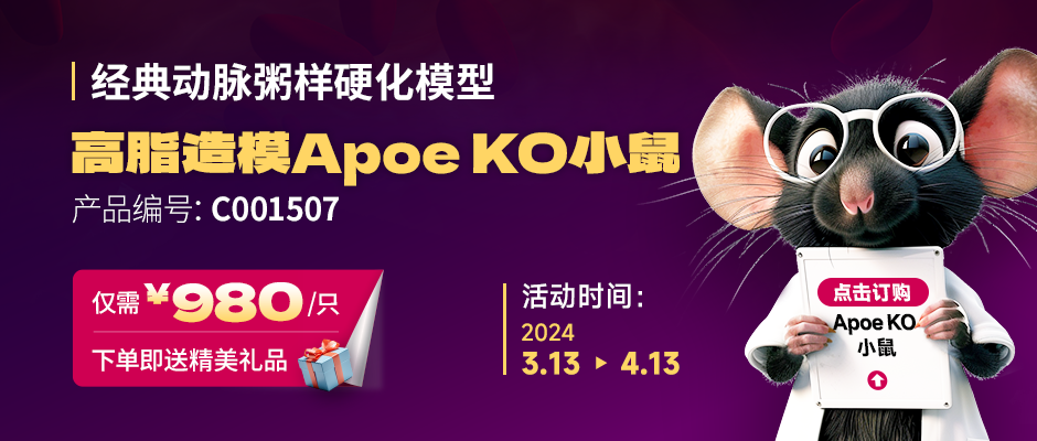 2024年3月13日至4月13日期间,订购高脂造模Apoe KO小鼠,仅需980元/只,下单即送精美礼品
