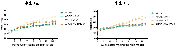 图1. B6J-Apoe KO小鼠和野生型(WT)小鼠在正常饮食和高脂饮食(HFD)*条件下的体重变化曲线。结果显示,B6J-Apoe KO小鼠在正常饮食和高脂饮食条件下生长情况大致相同。高脂喂养的野生型小鼠体重有所上升,内部检测数据显示在20周后,野生型小鼠心脏主动脉弓和主动脉血管均正常,无动脉粥样硬块产生。