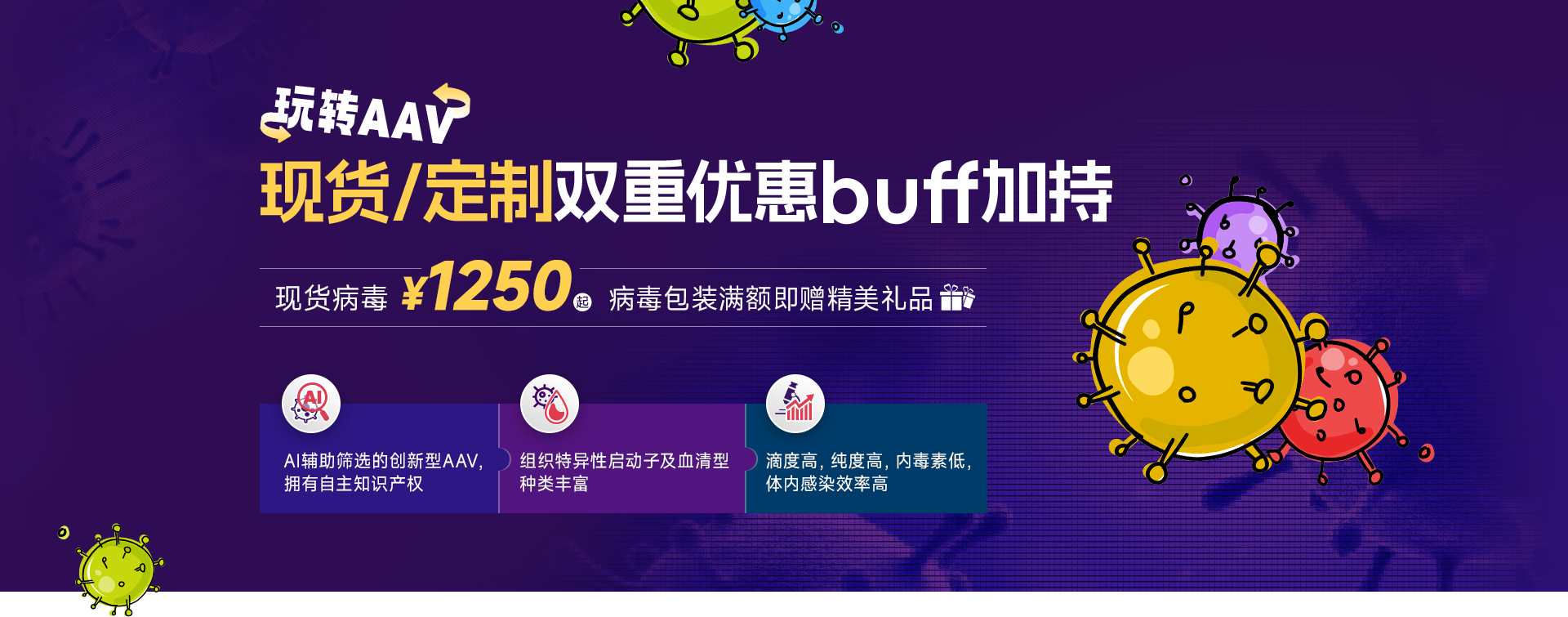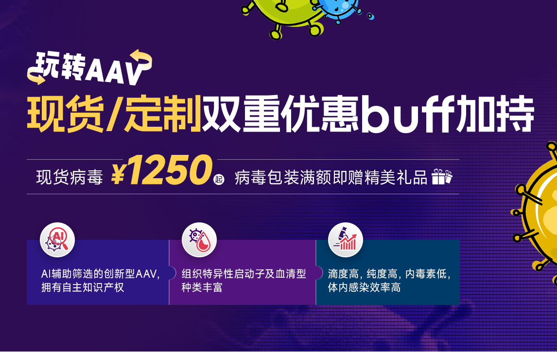 基于AI辅助的高效筛选技术,我们可以提供体外细胞或动物体内使用的创新型AAV纯化病毒,含过表达、干扰和敲除等类型,多种血清型可供选择。现在下单,多种规格的AAV对照病毒现货可享低至1250元的优惠价,快至2天发货;定制AAV病毒包装服务,累积金额满1万元赠送价值500元礼品(可叠加)。欢迎拨打400-680-8038或邮件至info@cyagen.com联系我们。