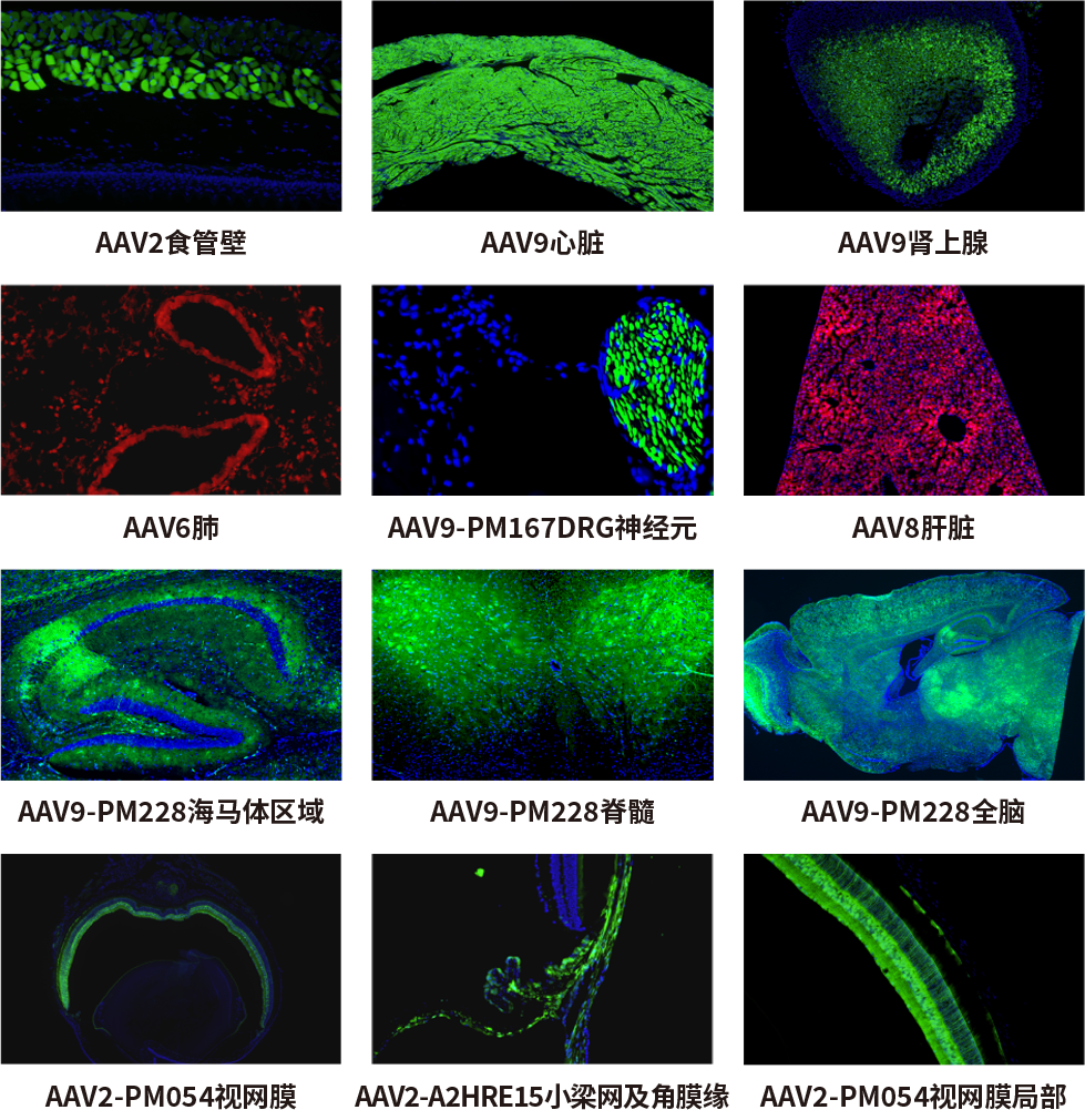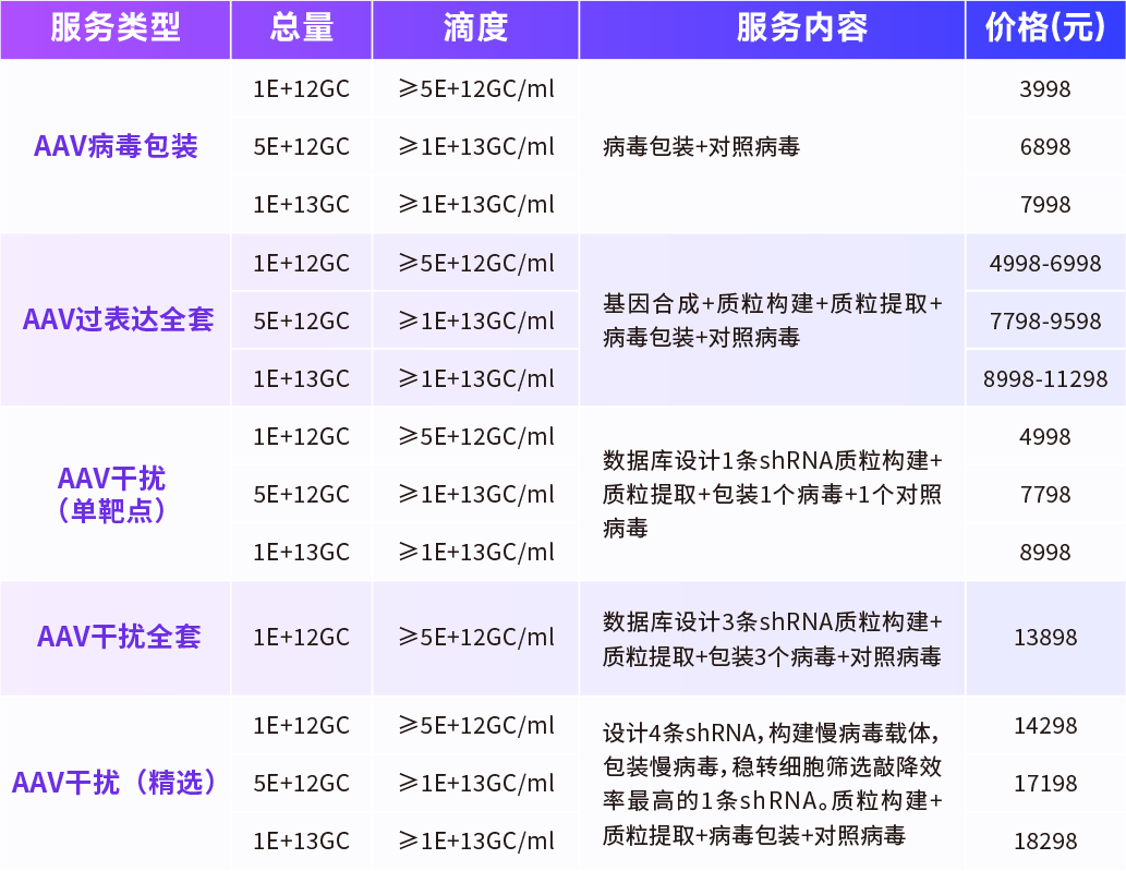 - 提供高纯度、高滴度、高活性的AAV病毒,组织特异性启动子及血清型种类丰富
