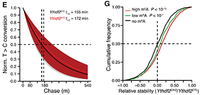 G,YTHDF2的缺失,使含m6A修饰mRNA半衰期进一步增长