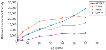 REVERT总蛋白染色比看家蛋白具有更宽的线性范围。定量需要在线性范围内进行。图中可看出C32细胞裂解物在超过20μg时,看家蛋白就开始饱和,并不能呈现线性相关。 而REVERT从1至60μg始终可以与上样量保持良好的线性关系。