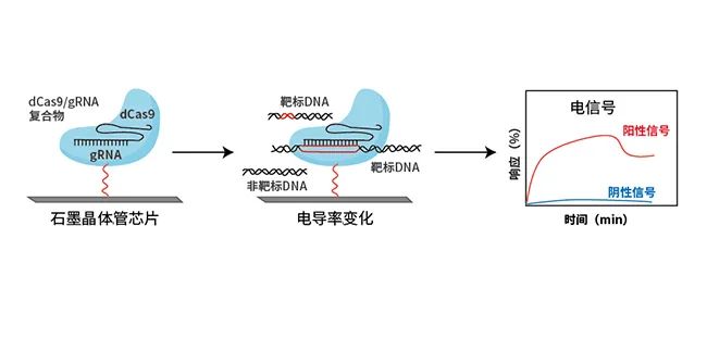 CRISPR Chip技术是将dCas9蛋白与石墨烯电子晶体管结合,dCas9识别目标DNA并将其连接到晶体管上,从而改变晶体管的导电性以产生信号。CRISPR Chip技术具有高灵敏度,可以在15分钟内检测低至1.7 fM的目标DNA。这种便携式、无扩增的方法被用于诊断杜氏肌萎缩症临床样本的外显子突变。
