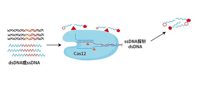 在基于Cas12的检测系统中,目标DNA在等温条件下通过重组酶聚合酶扩增(RPA)或环介导等温扩增(LAMP)进行扩增,当Cas12检测并切割特定的目标DNA序列时,它也会特异性地切割连接荧光分子的ssDNA,产生荧光信号。该检测系统已经应用于HPV和SARS-CoV-2等病原体的特异性检测。