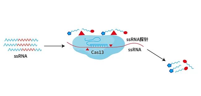 在基于Cas13的检测系统中,目标RNA在等温条件下通过重组酶聚合酶扩增(RPA)进行扩增,当Cas13检测并切割特定的目标RNA序列时,它也会特异性地切割连接荧光分子的ssRNA,产生荧光信号。该检测系统已经应用于寨卡病毒和登革病毒的特异性检测。