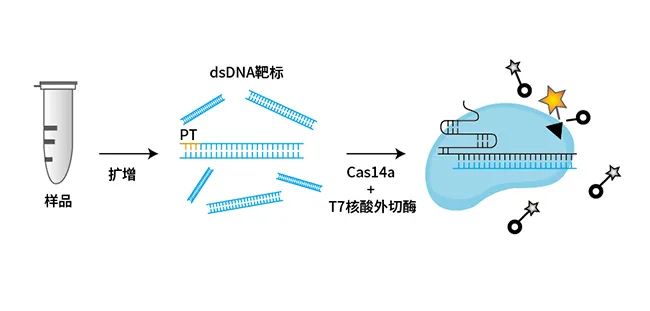 在基于Cas14的检测系统中,目标ssDNA经过扩增后,当Cas14检测并切割特定的目标ssDNA序列时,同时会特异性地切割连接荧光分子的ssDNA,产生荧光信号。该检测系统显示出更强的特异性,可以高保真检测DNA SNP,如控制人类眼睛颜色的变体HERC2。