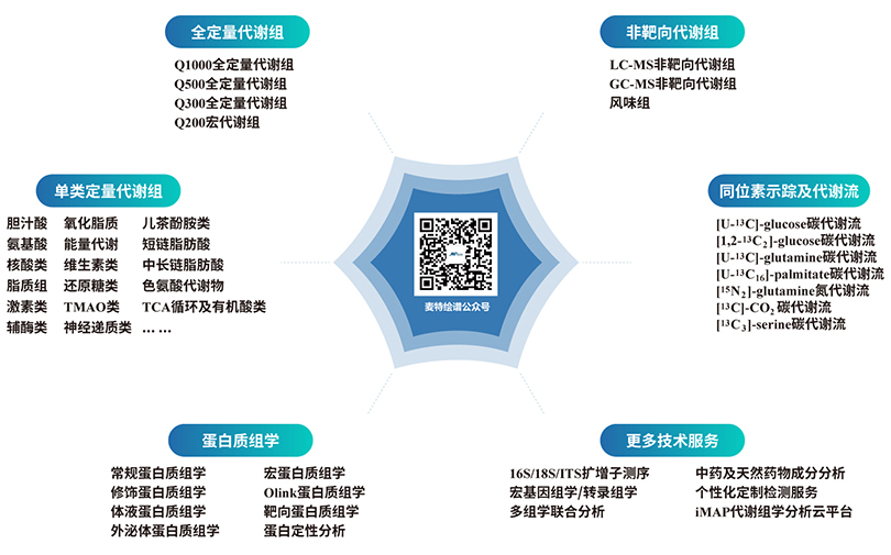 麦特绘谱生物科技(上海)有限公司(Metabo-Profile)汇聚了从事代谢组学和转化医学研究近二十年的海内外专家团队,专注于精准医学和健康领域的高端代谢组学技术服务,是一家集科技服务、健康检测及产品研发于一体的国家级高新技术企业、上海市“专精特新”企业,已成为代谢组学研究者的优选合作伙伴。公司拥有自建1500+功能性小分子代谢物数据库JiaLib™、国际的代谢组学分析技术平台和全自动化TMBQ定量数据处理软件、代谢组学数据在线分析平台iMAP。麦特绘谱已为数百家三甲医院、科研院所和企业提供高端代谢组学一站式整体解决方案,协助客户与合作伙伴发表SCI文章240多篇,累计影响因子2300+,包括Science, Cell Metabolism, Immunity, Gut, Signal Transduction and Targeted Therapy, Science Translational Medicine 等领域内权威期刊。