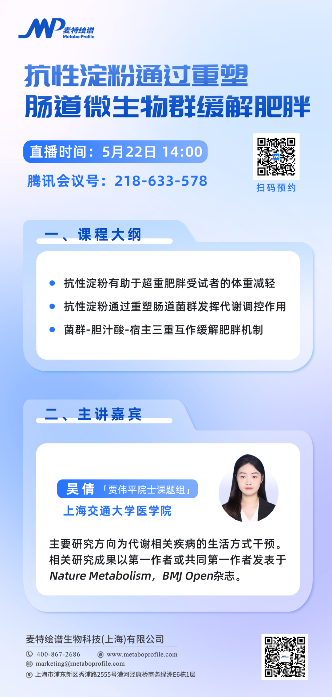 2024年5月22日14:00,麦特绘谱特邀本篇研究第一作者吴倩(上海交通大学医学院)做客绘谱学堂,带来关于《抗性淀粉通过重塑肠道微生物群缓解肥胖》的主题报告,为各位科研同仁分享此篇文章的研究故事。欢迎大家相约直播间,会后特设答疑环节,线上一起探讨研究热点、交流科研观点。