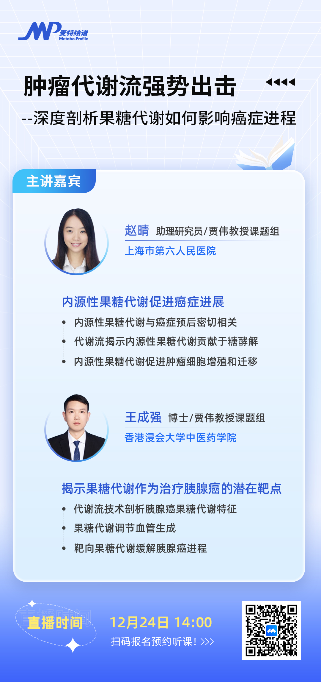 2024年12月24日14:00,麦特绘谱特邀两篇文章的第一作者赵晴助理研究员、王成强博士做客绘谱学堂,分别带来关于《内源性果糖代谢促进癌症进展》、《揭示果糖代谢作为治疗胰腺癌的潜在靶点》的主题报告,为各位科研同仁分享此篇文章背后的研究故事。欢迎大家相约直播间,会后特设答疑环节,线上一起探讨研究热点、交流科研观点。